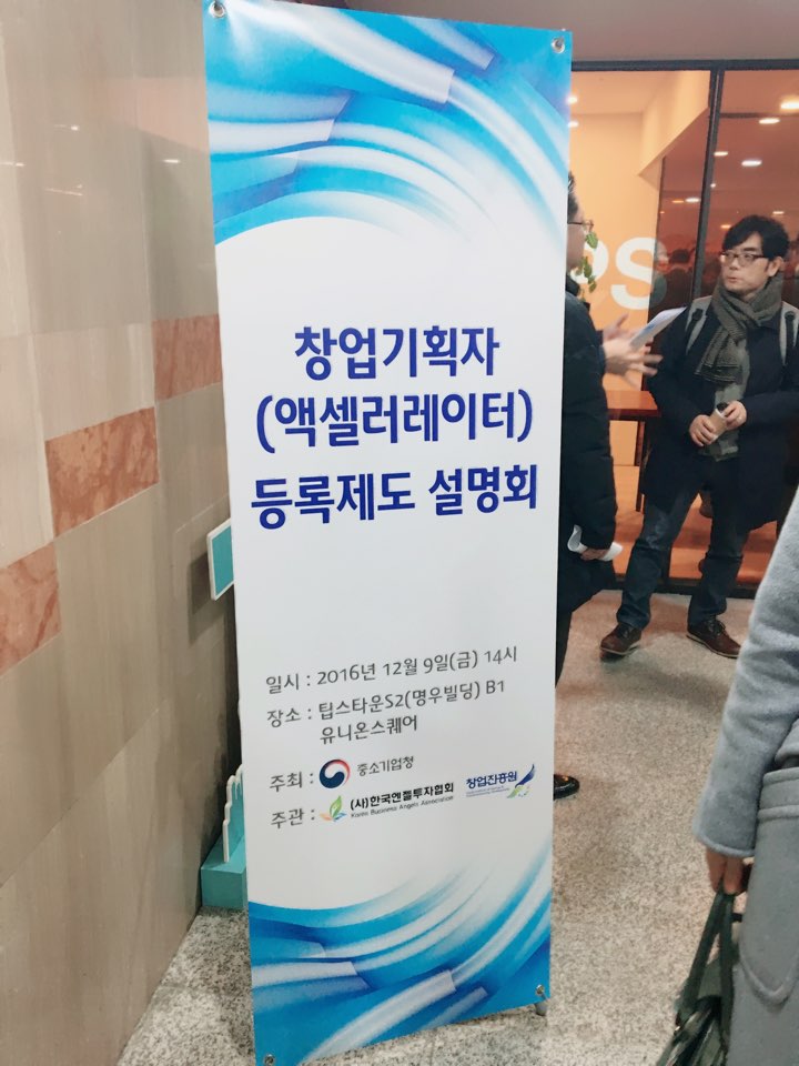 2016년 12월 9일 금요일 오후 2시 창업기획자(액셀러레이터) 등록제도 설명회가 있었습니다. 중소기업처이 주최하고, 한국엔젤투자협회 및 창업진흥원이 주관한 이번 설명회에서는 중소기업창업지원법 등에 따라 액셀러레이터로 등록을 하는 경우에 대한 절차, 혜택, 그리고 요건 등에 관한 설명이 이루어졌습니다.